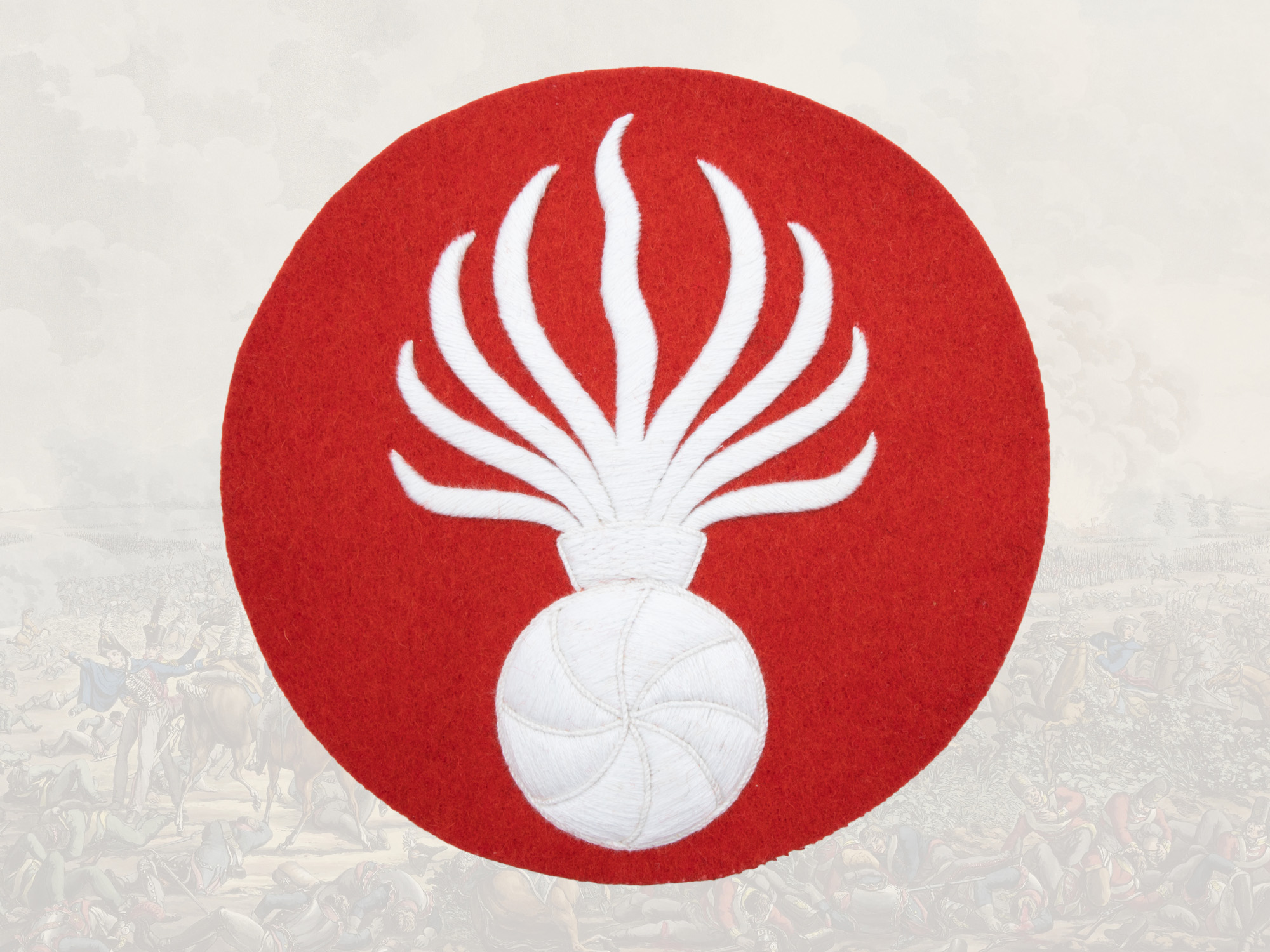 Bearskin grenade white embroidery on red wool